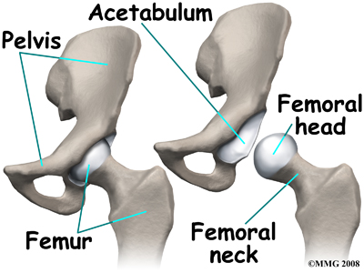 The hip joint is a true ball-and-socket joint. The bones of the hip are the femur (the thighbone) and the pelvis. The top end of the femur is shaped like a ball. This ball is called the femoral head. The femoral head fits into a round socket on the side of the pelvis. This socket is called the acetabulum.